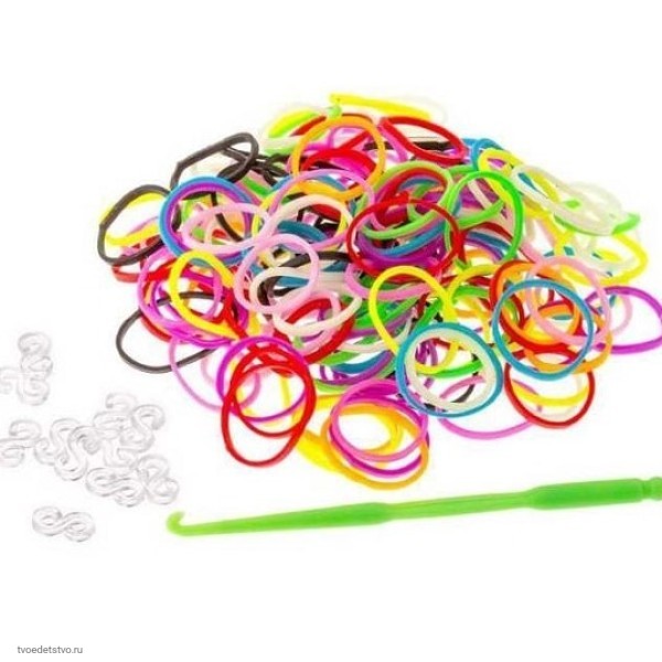 Резинки разноцветные, прочные и качественные. В один пакетик входят резиночки + крючок и клипсы.