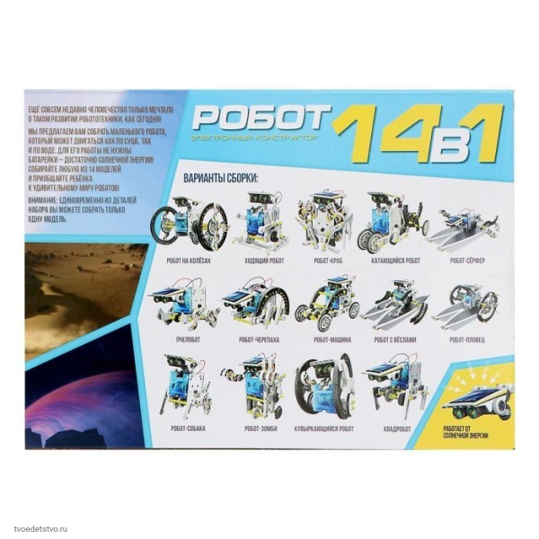 Для того чтобы робот начал двигаться, ему не нужны обычные батарейки, модели конструктора работают от солнечной батареи. Играйте с роботом на свежем воздухе в солнечную, ясную погоду! Тогда он будет работать лучше всего! Для игры дома используйте галогенно-вольфрамовую лампу на 100 Вт.