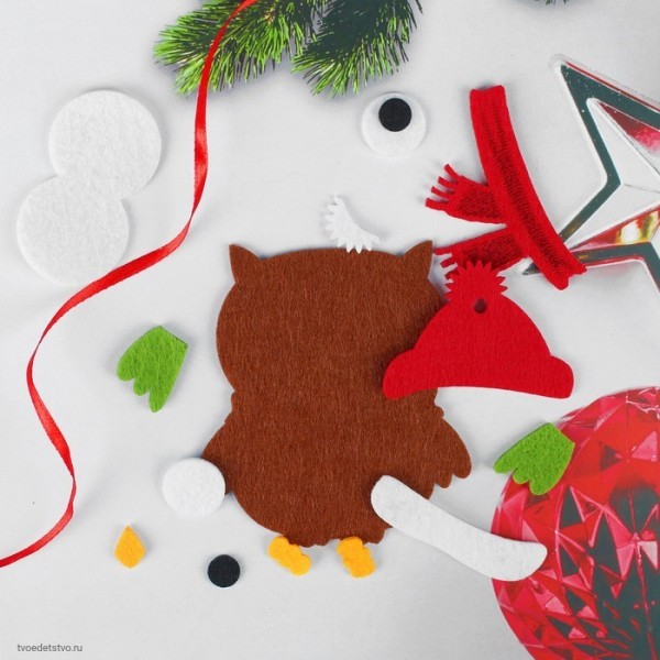 - Скрепите детали между собой с помощью клея. При создании украшения вы можете ориентироваться на изображение готовой поделки из набора.